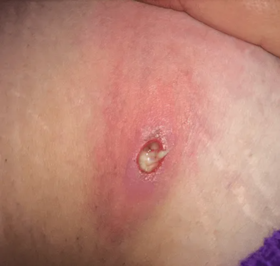 Hygienic neglect and open wounds may cause a staph infection, or MRSA (Methicillin-resistant Staphylococcus aureus), which causes a deep infection with reddening of the skin surrounding the site of infection, filled with a yellow/gray pus.